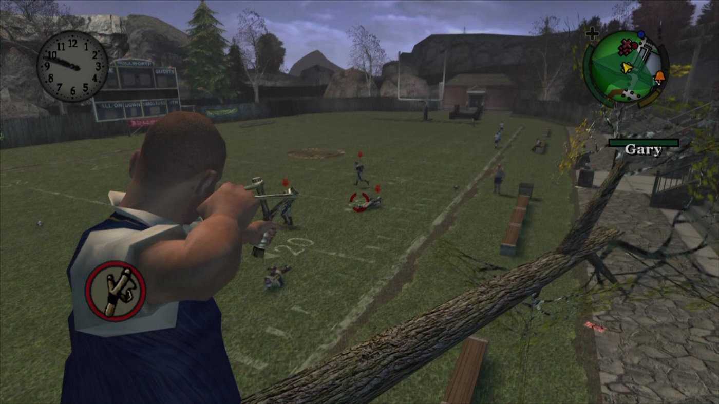 Continuing Bully’s design philosophy of creating a smaller yet more detailed world, the combat in the game focuses almost entirely on hand-to-hand encounters. This is, seemingly, to make up for the lack of variety of projectile weapons. In GTA you’d have a large selection of firearms to choose from, in Bully you’re taught different button combination fist fighting moves from attending gym class (and bringing radio parts to a Vietnam-vet hobo living behind the school car park). This results in encounters with enemies and other ne’er-do-wells that have an immediate and visceral punch to them. The combat is more complex than the point and shoot mechanics one might expect from Rockstar, with different moves being used to counter your opponent’s stance. If they are blocking, you can try a combination for a leg sweep attack to bring them to the ground, or you can grapple them up close and throw them to the floor, getting a few cheap hits in on the way. There is an effective schoolyard scrappiness to the whole affair, once again a deliberate mechanical design choice to enhance the game’s potent, considered atmosphere. There are turret-style slingshot sections and, later in the game, a few more ranged weapons that Jimmy can obtain, but these regularly take a backseat to the in-your-face confrontations. A lot of the available weaponry is used for more general chaos and player experimentation, like egging cars and tripping up your pursuers Hannah-Barbera style.