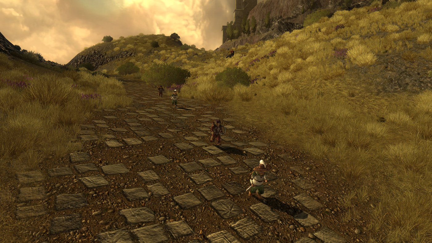 Our stopover at the establishment was brief, enough for a quick drink and to set our respawn at the milestone just outside the front door. We quickly marched on, single-file and as close to each other as the game would allow. The enemies in the nearby fields were more aggressive than they had been in Bree-Land, approaching us more often and in far greater numbers. The road was more akin to a dirt path, which twisted its way through the harsh, bumpy environment. As we continued, two seemingly innocuous, yet soon-to-be very important events occurred. The first was an inevitability; the sun began to set behind us. The warm orange glow that enveloped us was picturesque but served as an unwelcome reminder of the approaching nightfall. We had not taken something as ubiquitous and universal as the passage of time into account and, if we were not careful, we would soon be stuck in the wilderness in pitch darkness. The second event was the strange fact that we were now being followed, not by a mob, or by an NPC, but by another human player. Greleg, Watcher of Roads was tailing us on horseback.