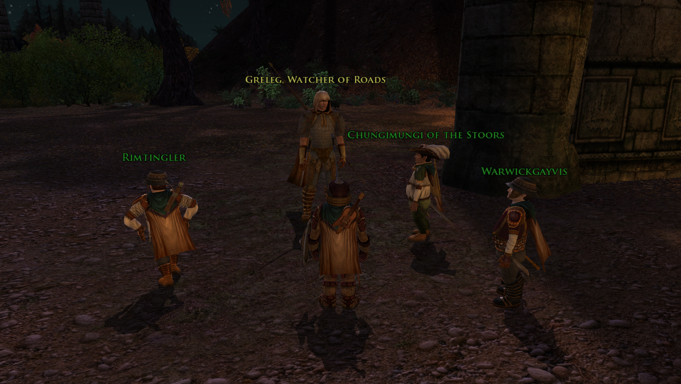 It was at The Last Bridge and under cover of darkness that Belta Tunnilly appeared before Largeo and I. She greeted us warmly and told us to follow her. We set out on the path that had quite recently been our grave, but this time, we had a new friend to back us up. Belta deftly and expertly one shot every creature that came anywhere near us. A single arrow was all it took each time, our fallen enemies piling up on the roadside. Halfway along, a heroic figure emerged from the brush. Greleg, now clad in a roguish white hood, appeared anew before us, sword in hand, returned from death with renewed vigour. He joined our party, pulling monsters away from us and assisting Belta in their swift dispatch. The journey towards the encampment was truly something, a triumph that assuaged all our initial doubts and fears. If the unlikely duo of Belta and Greleg wasn’t enough, we were also suddenly joined by an elegant female Elf. The enigmatic Ealotiel Swift Arrow, a surprise third party, helped us out during the final stretch to reunite with our Hobbit friends. This Elf, as we soon found out, was recruited by Warwick (who initially believed the player to be AFK) and despite being late, was more than willing to assist us. As we wound up the hill to finally re-join the group, great jubilation broke out in the Trollshaws. Music was played, praise was lavished upon our three heroes and all nine of us danced by the campfire. After this well-deserved celebration, we made one final request of our new friends; would they escort us through the remaining stretch of wilderness to Rivendell? Belta wholeheartedly agreed, Ealotiel said nothing, but seemed to ready herself for the journey and Greleg, in true Greleg fashion, simply nodded.